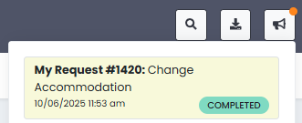 3. Once approved, the accommodation will be assigned to the student. A red dot on the Notifications icon in the navigation bar will indicate an alert when the request is either granted or rejected. Select the icon to see notifications. You can select the notification to access My Requests