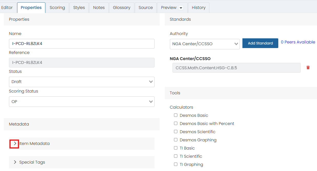 As part of item creation, be sure to complete the Properties tab. The Properties selection options for Name, Status, Standards and Metadata depend on bank configuration.