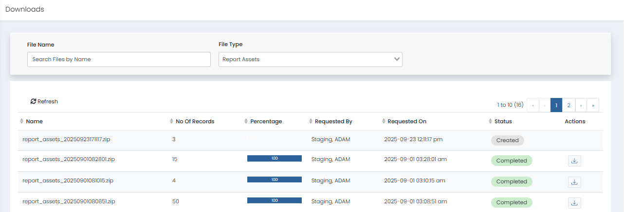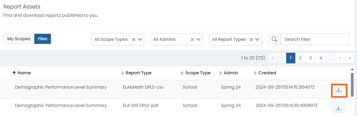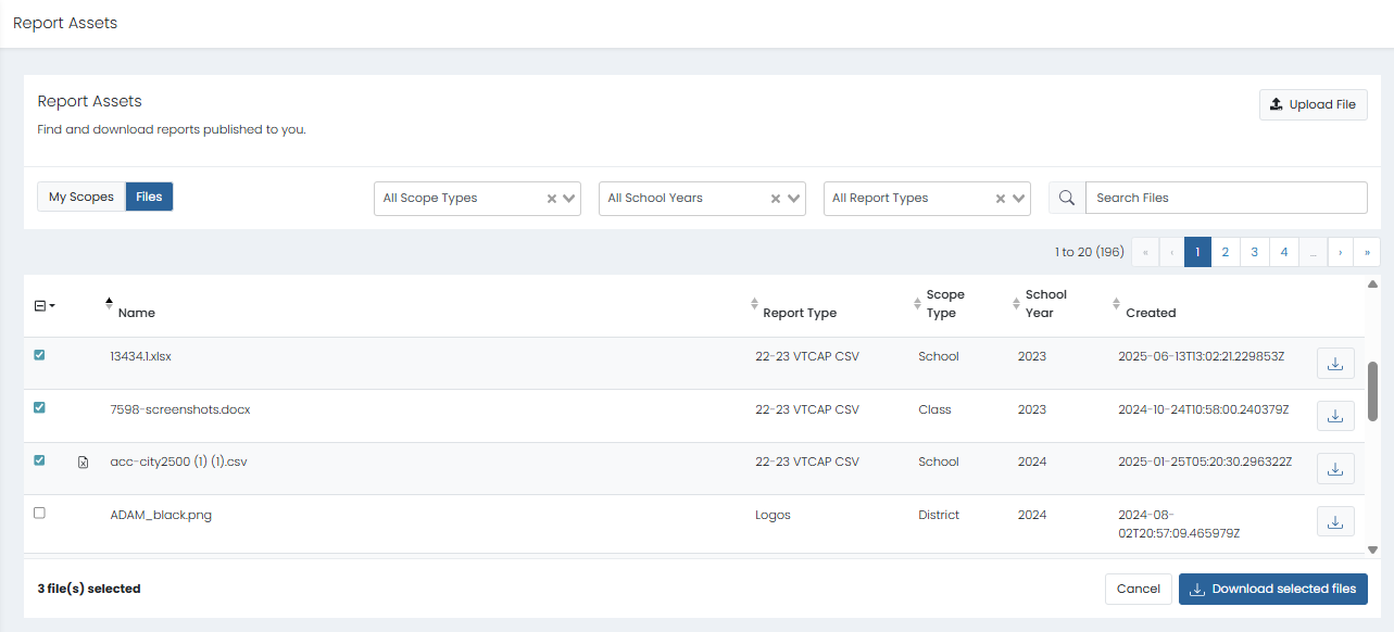 The Report Assets page provides any available downloadable reports or other files/PDFs. This page is available only when it is enabled and your role has permission to access it. The ability to add files is also permission-based.