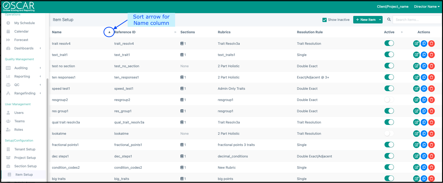 For items that are already created, the Item list on the Item Setup page contains some key information about the Item Details and a few functions. The Item list will appear in order of when the item was created by default. By clicking on the arrow button to the right of the column header, the Name, Reference ID, and Active columns can be used to sort the list alphabetically. The search bar can also be used to find a specific item, searching by name or ID.