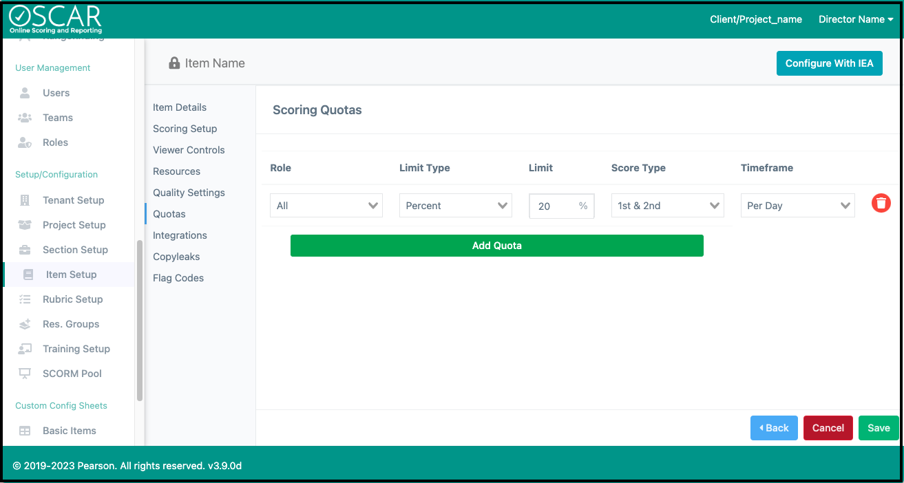Create Item Quotas that will enforce a maximum number of responses raters will be allowed to score on the item. Quotas are specific to rater roles, score types, and timeframes. Multiple Quotas can be created for an item and each one will be checked independently. Once a rater meets the quota, they will not be able to score anymore responses on the item until the timeframe expires or the quota is removed. Rater progress on Quotas can be viewed on the Quotas Reporting page.