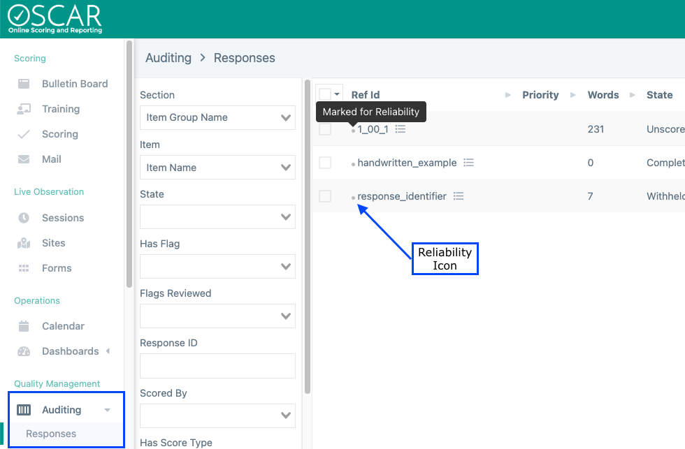 This controls what percent of the responses will require a second read. Responses are chosen randomly for reliability. Creating a Double Score Exact item type with 20% reliability will result in 20% of the responses, selected at random, getting a second read. Of those 20% with two scores, any non-exact scoring matches will require a resolution read in this example. Responses are marked for reliability when responses are loaded into OSCAR. Which responses were chosen for reliability can viewed from the Auditing page; any response with a dot icon next to the response ID will require a reliability score.