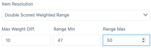 - Double Scored Weighted Range: This setting will allow the user to configure the Max Weight Diff and a min/max range. The specified percent of responses get two scores and responses will go to resolution if any of the following conditions are met.