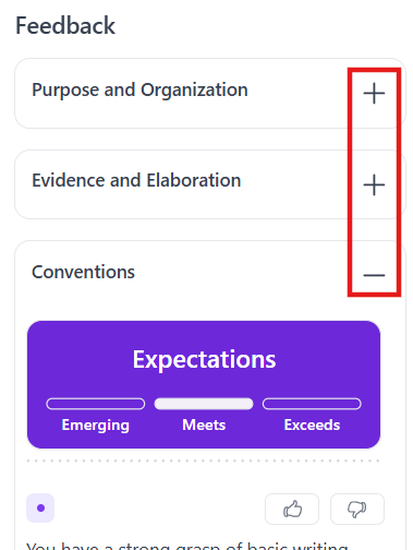 The student can provide a thumbs up or thumbs down to provide feedback on the comments.